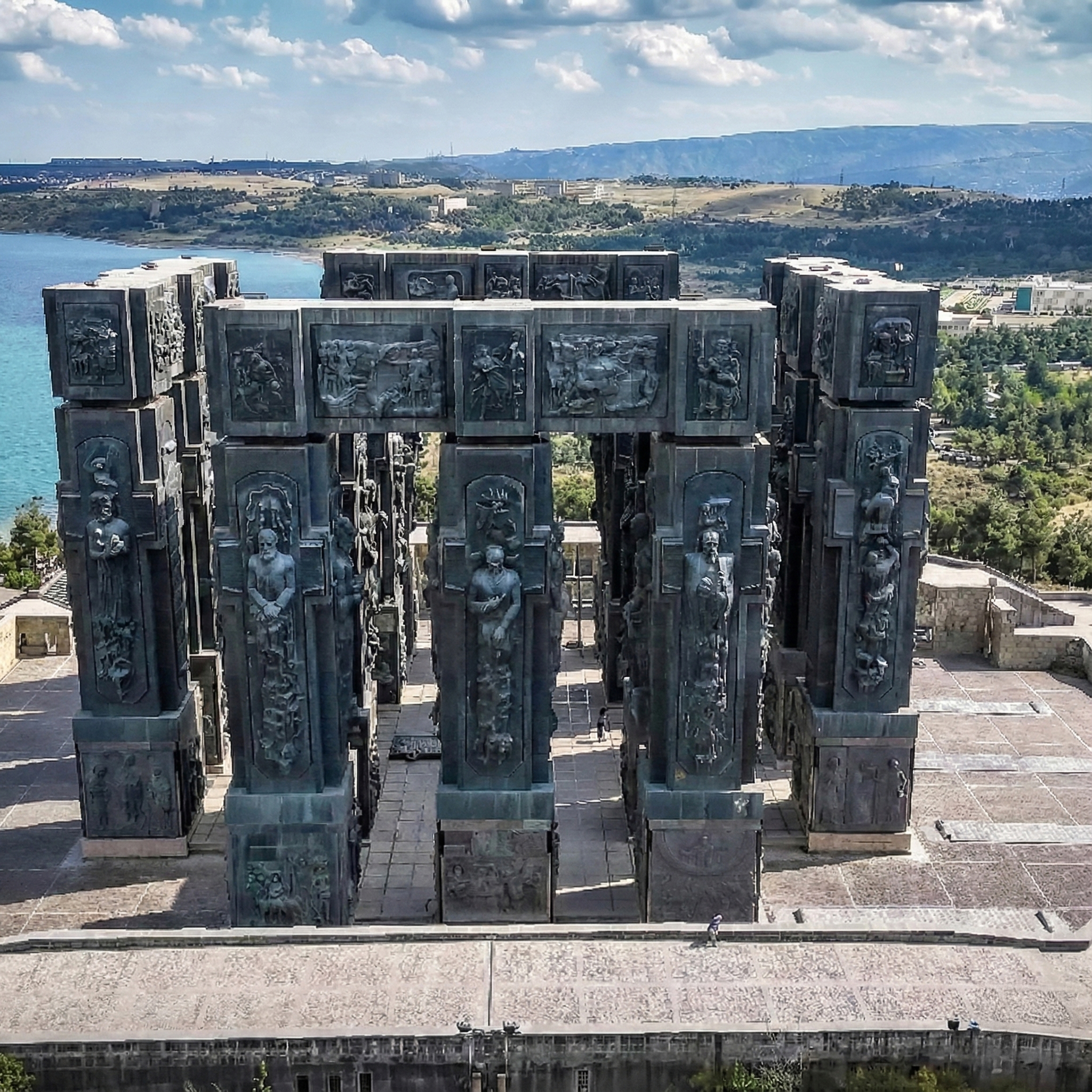 Discover a towering monument overlooking the Tbilisi Sea, showcasing Georgia’s rich history through dramatic stone carvings and breathtaking views.